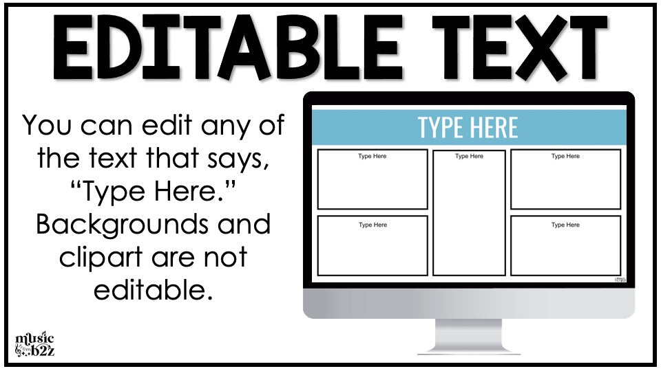 ‘Editable’ refers to the *text* within the file being customizable. Clipart, backgrounds, and color palettes are not editable. Simply type into the text boxes provided or add in your own to edit.