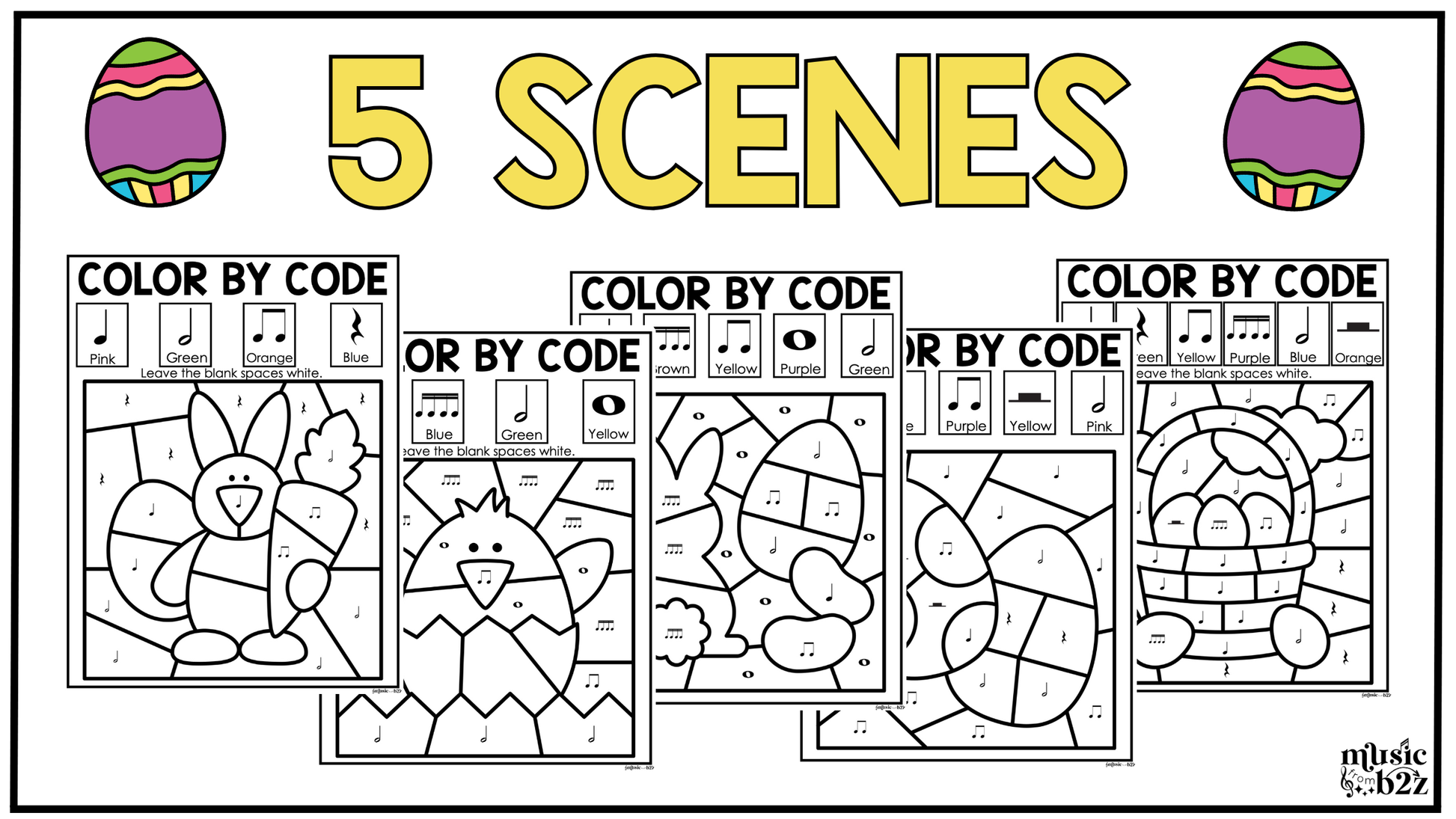 Each music color by note page focuses on common rhythms like quarter notes, eighth notes, and half notes. As students correctly identify each rhythm, they color in parts of the picture to reveal a fun Easter design. It feels like a game, but it’s actually a great way to check for rhythm understanding in a low-stress way.