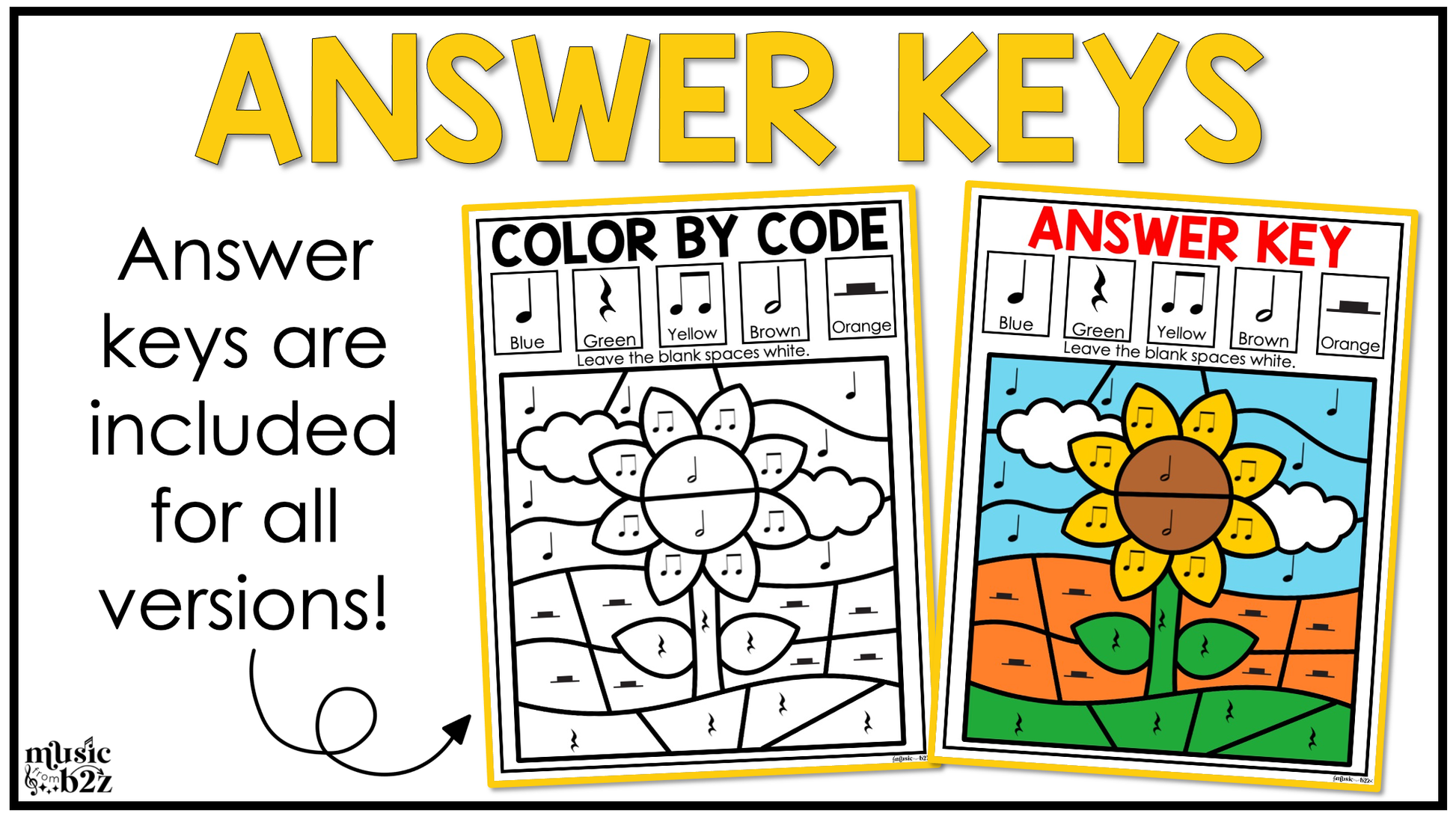 Each music color by note page focuses on common rhythms like quarter notes, eighth notes, and half notes. As students correctly identify each rhythm, they color in parts of the picture to reveal a fun fall design. It feels like a game, but it’s actually a great way to check for rhythm understanding in a low-stress way.