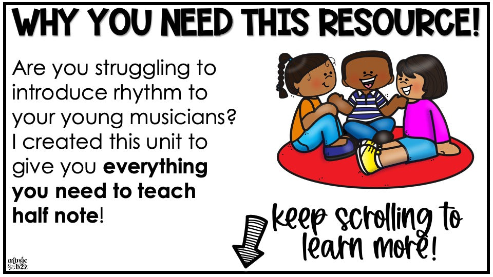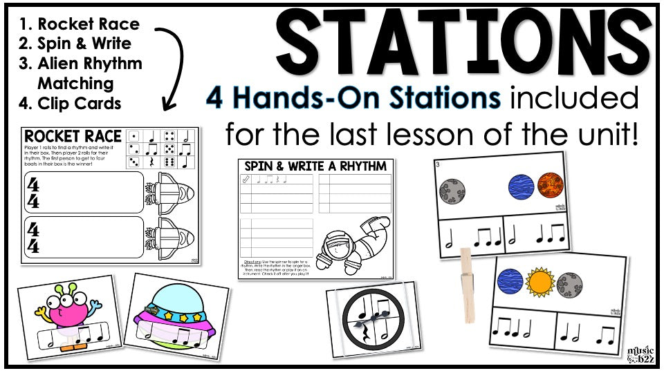 For the last lesson of the unit, students will have a station (center) day! Students will rotate through engaging centers that reinforce half note. It's the perfect way to wrap up the unit and check in with your students' understanding.