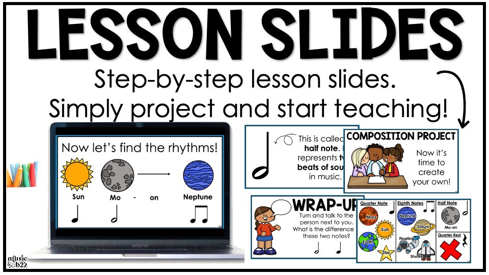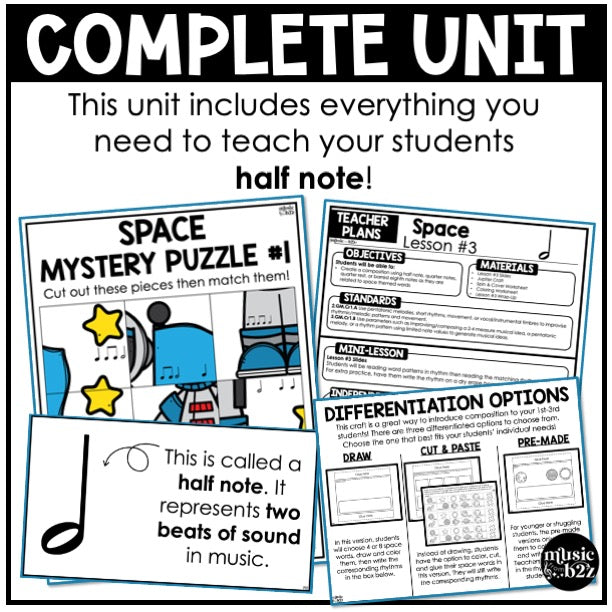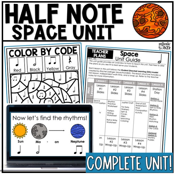 Elementary music teachers, are you ready to take your Rhythm Units to the next level? Take your students on an adventure to outer space as they learn about half note! Students will learn about space themed words to learn about quarter notes, eighth notes, quarter rest, and half note.