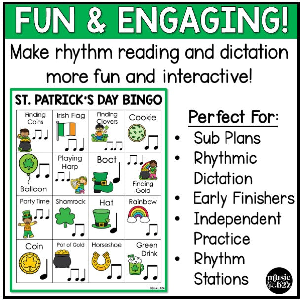 As music teachers, we know that student engagement goes through the roof when we add the excitement of a holiday or theme! This music bingo game is not only an entertaining St. Patrick's Day activity, but also is an effective way to reinforce the concept of quarter and eighth note rhythms!