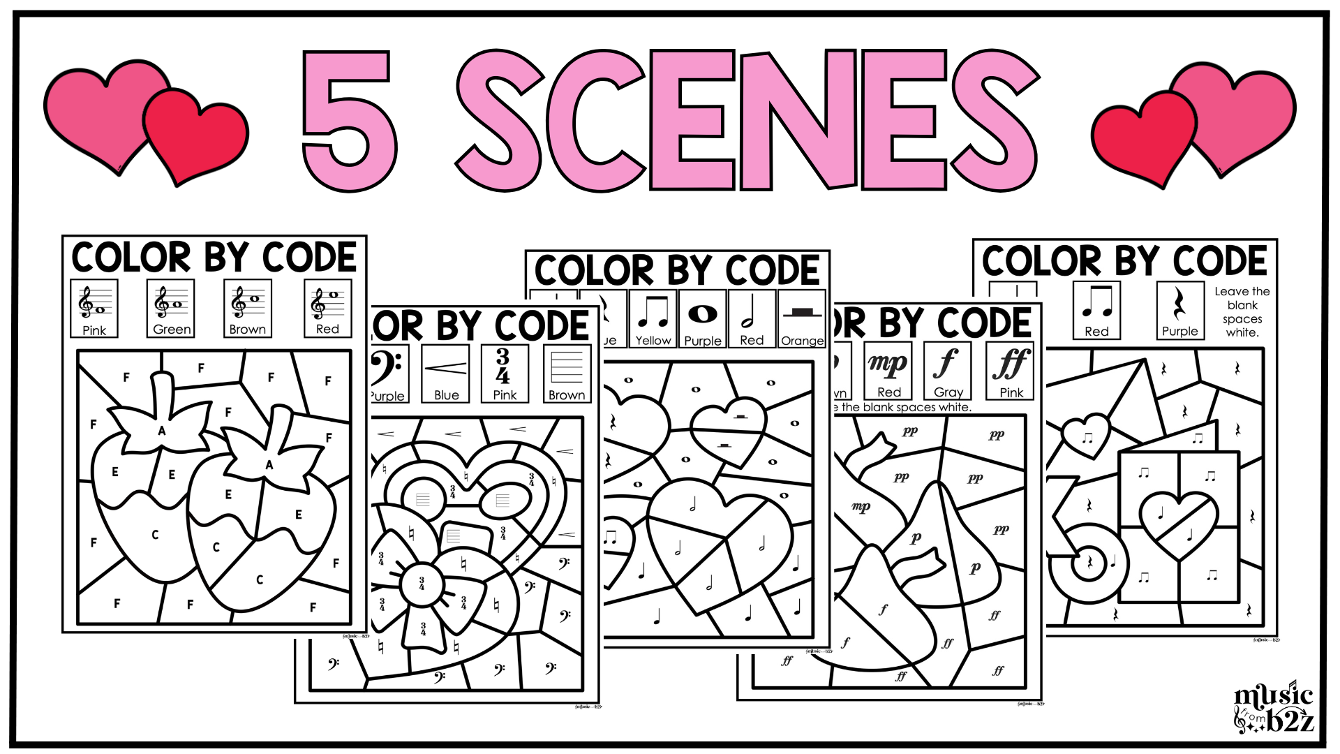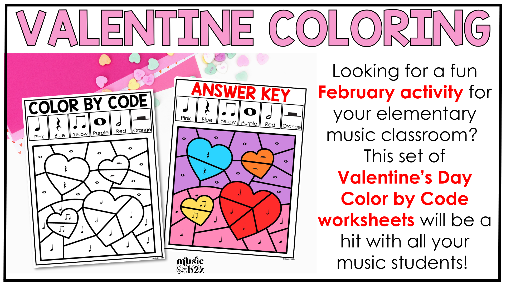 Make February lesson planning a breeze with this Valentine's Day Music Coloring Bundle! This set includes four different collections of color-by-code worksheets that cover rhythm, treble clef pitches, dynamics, and music symbols. Each page features a Valentine-themed design that students bring to life by matching musical concepts to a color code. It’s the perfect combination of music coloring fun and meaningful practice.