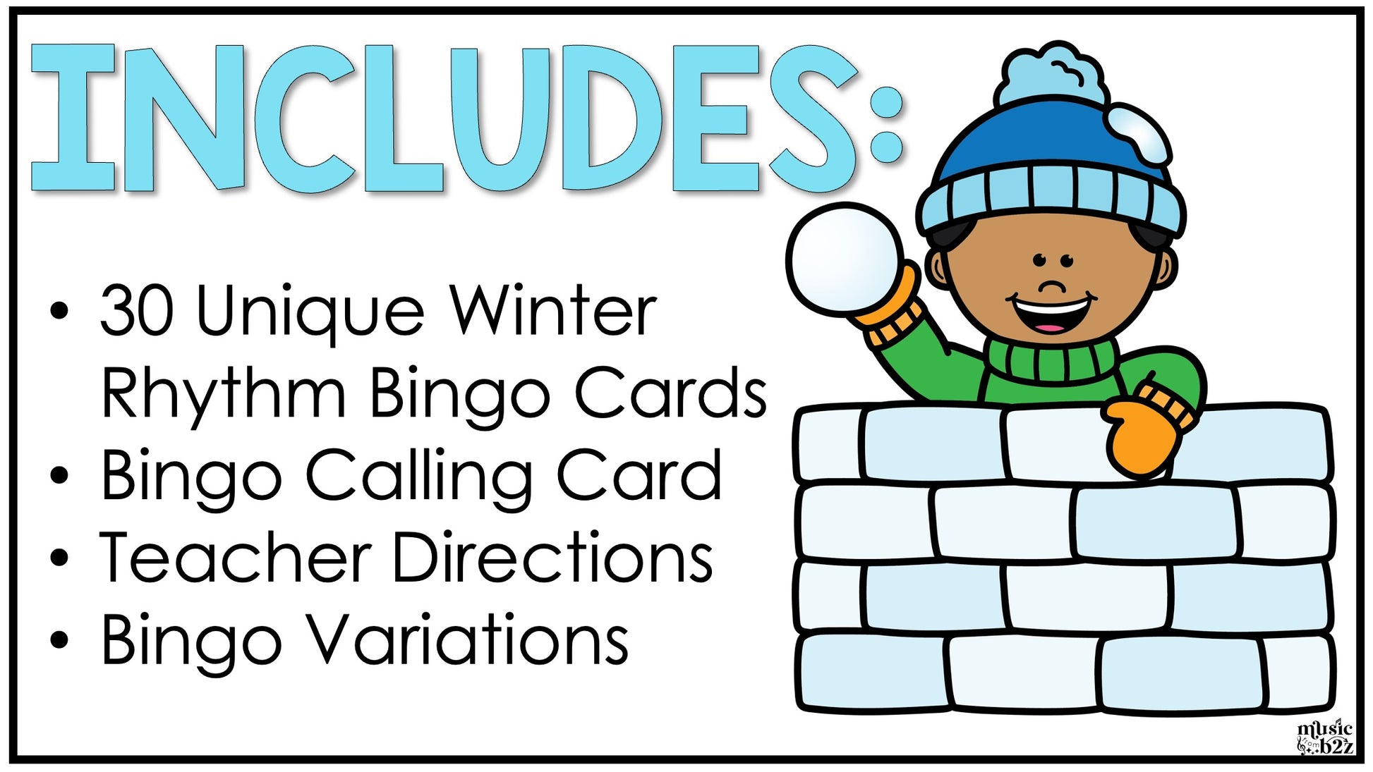 This resource includes 30 unique bingo cards, ensuring that every student in your classroom can actively participate. The calling card features all the winter words and rhythms making it easy to guide the game.