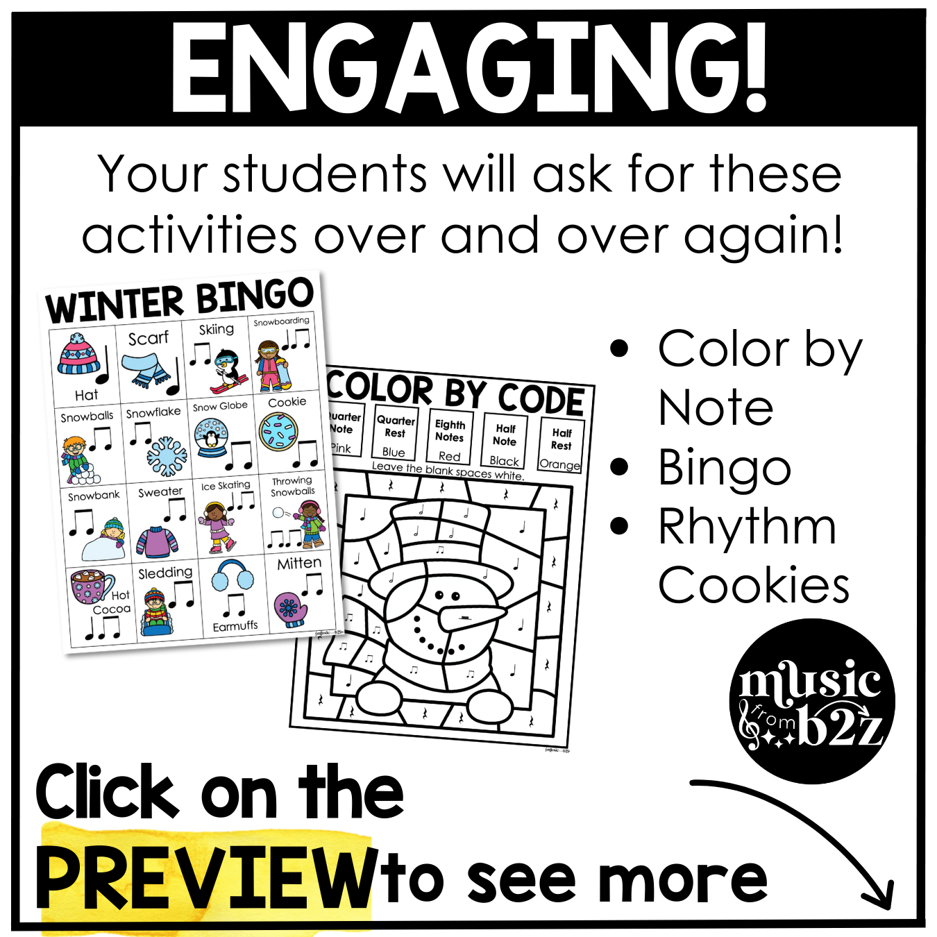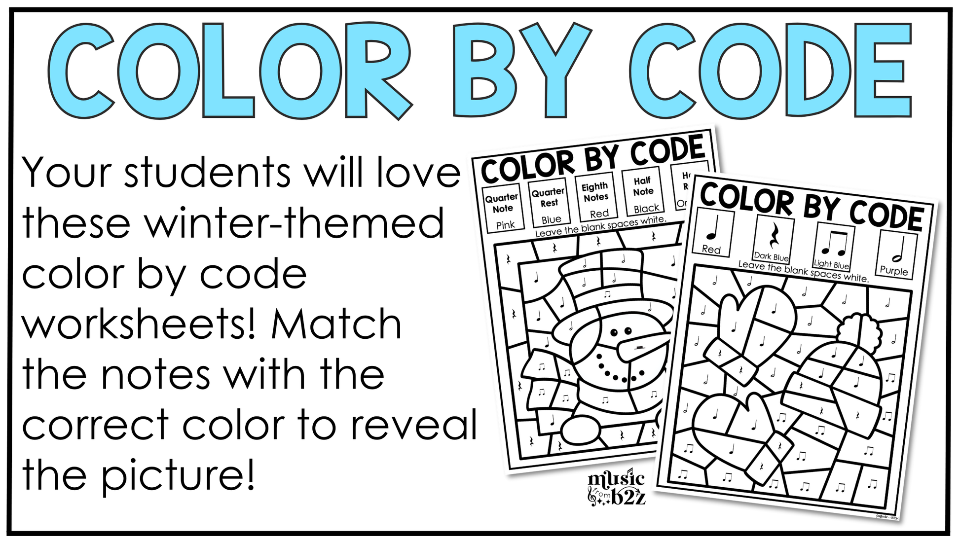 These winter music activities also support strong classroom management. Students stay focused because the tasks feel like creative challenges rather than repetitive drills. Color by Code provides quiet, calming work time, while Rhythm Cookies and Bingo bring in movement, interaction, and problem-solving. This balance makes it easy to tailor your lesson to whatever your class needs that day.