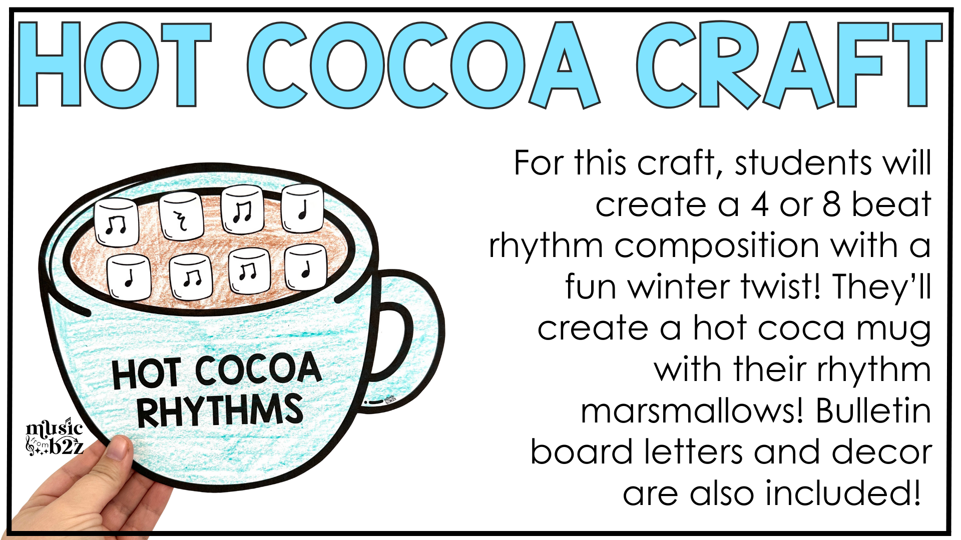 Students create a cozy winter hot cocoa mug by building a 4-beat or 8-beat rhythm using rhythm “marshmallows.” This music craft combines rhythm composition with creativity, making it a perfect calm center or follow-up activity after an active lesson. Students love choosing and arranging their rhythms, and teachers love how easy it is to prep and display.