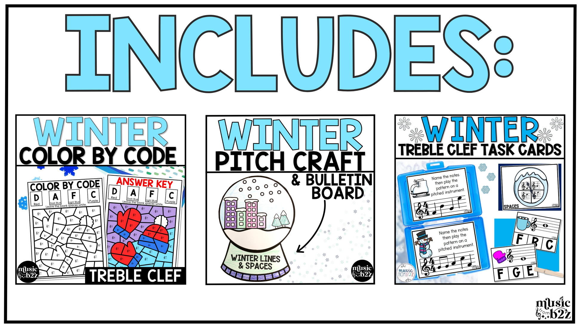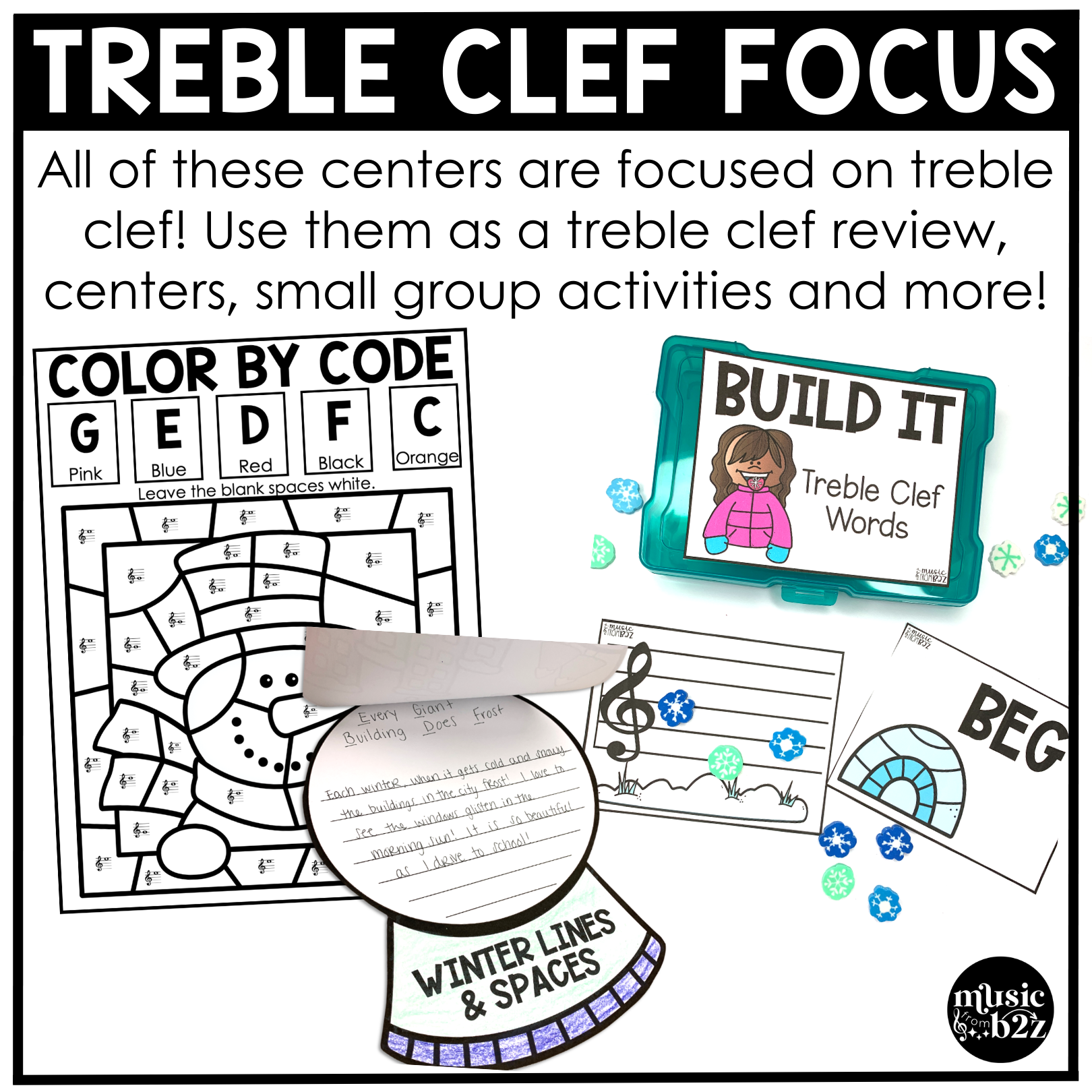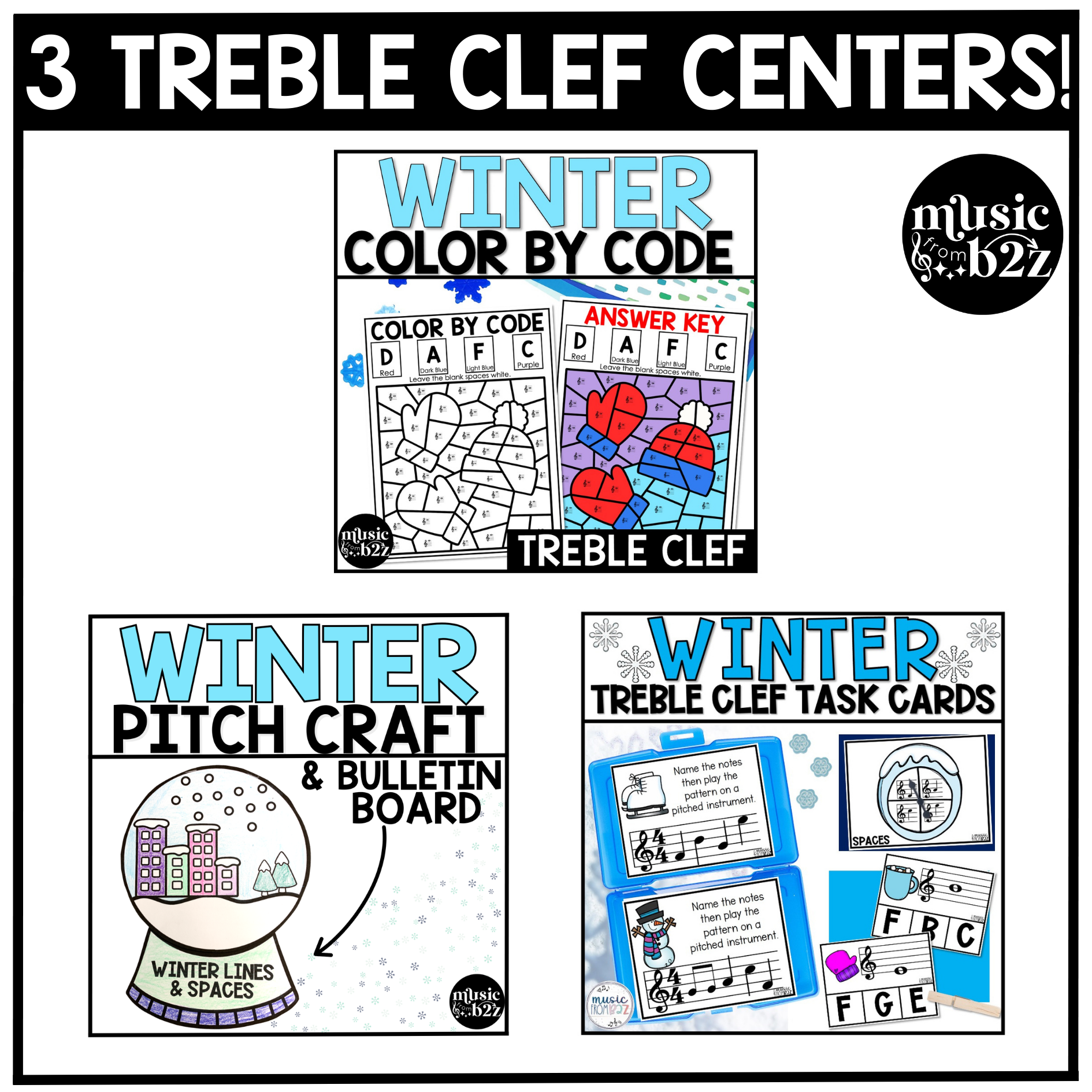 Each resource works well on its own, but together they create a cohesive set of winter music centers focused on treble clef mastery.