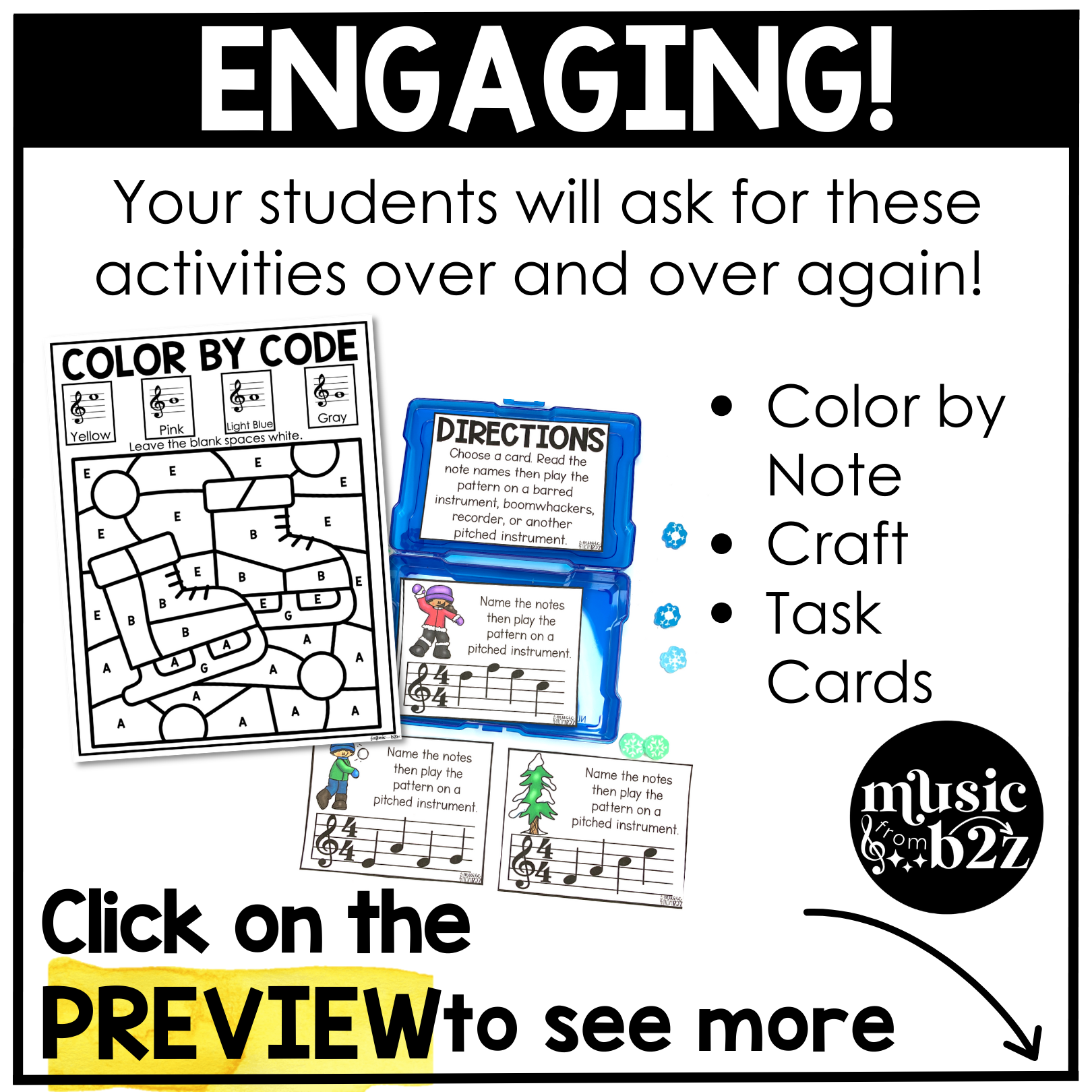 Teachers love the balance this bundle provides. Instead of relying on memorization alone, students get visual, hands-on reinforcement through a music craft, along with structured practice using music worksheets and task cards. This variety supports different learning styles and helps concepts stick.