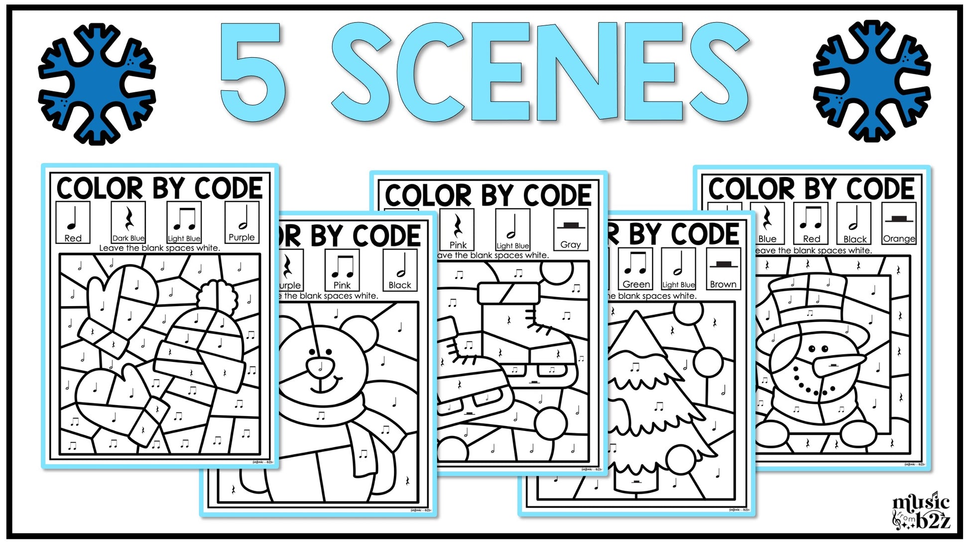 Each music color by note page focuses on common rhythms like quarter notes, eighth notes, and half notes. As students correctly identify each rhythm, they color in parts of the picture to reveal a fun winter design. It feels like a game, but it’s actually a great way to check for rhythm understanding in a low-stress way.